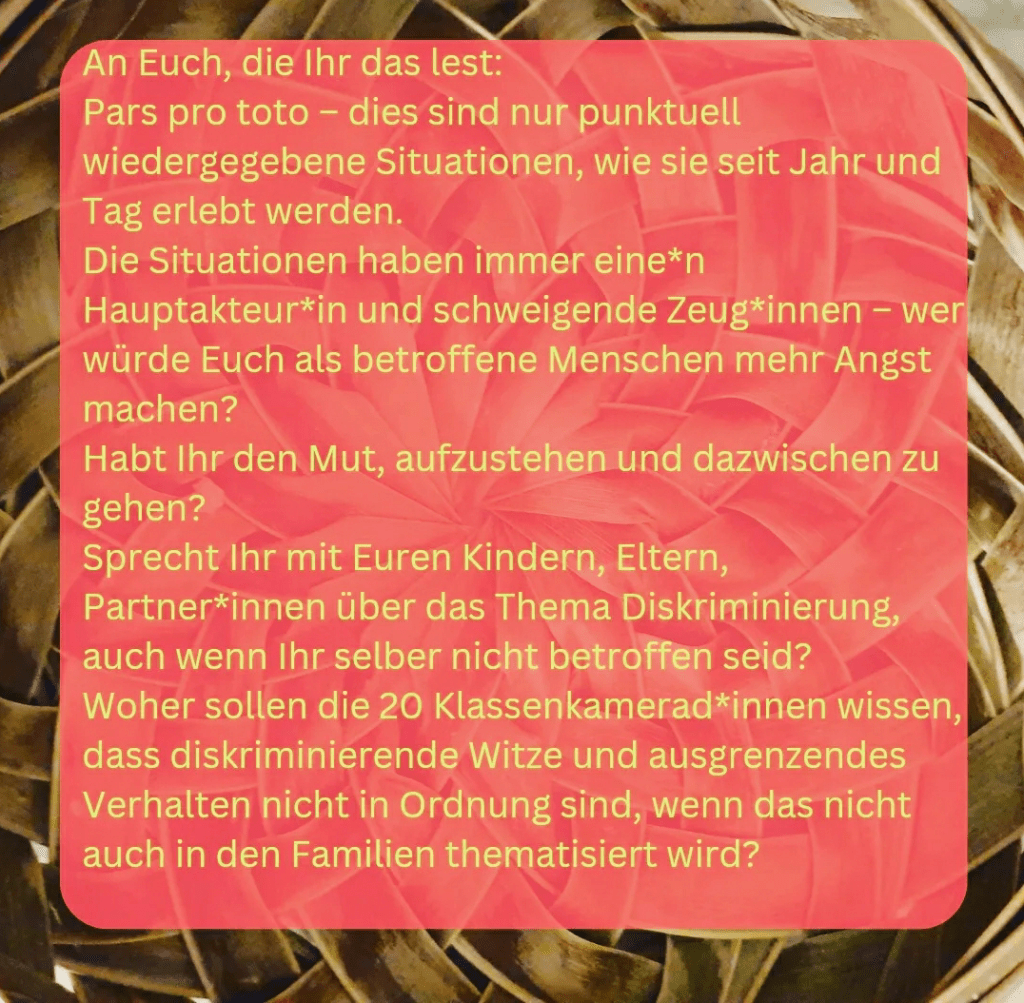 Erziehung und Bildung sind wichtige Felder, in denen antirassistische Werte (außerhalb der Familie, die den Grundstein legen sollte) und ein Verständnis für die Alltäglichkeit von Rassismus und das eigene Verankert-Sein in diesem Denken vermittelt werden könnten. Dafür müssen die Vermittler*innen aber für die Thematik sensibilisiert sein. Manchmal hat man Glück und trifft auf Personen, die offen sind – auch das ist uns passiert, um auch noch etwas Positives zu berichten: Lehrer*innen, die dankbar sind für Hinweise auf unsensibel bebilderte Klassenarbeiten oder auf etwas zu leichtfertig Dahingesagtes zur Genthematik, die zuhören können und Erfahrungen ernst nehmen und sie in Diskussionen aufnehmen, auf eine Art, die die Betroffenen nicht bloßstellt.