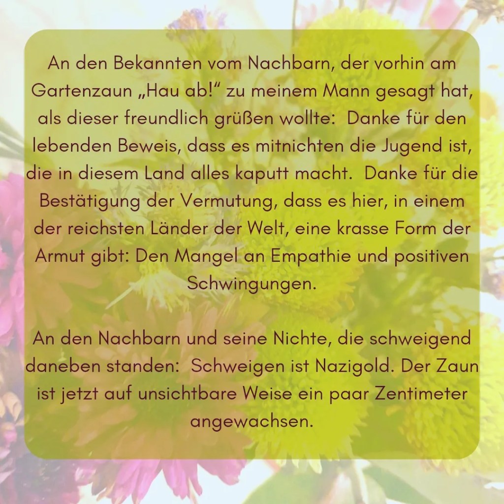 Gibt es Euch nicht zu denken, was heute auf deutschen Straßen wieder alles so laut gesagt wird, was wieder „salonfähig“ geworden ist? Wir sollten eigentlich wissen, dass es nie zu früh sein kann, aufzustehen und den Mund auf zumachen.